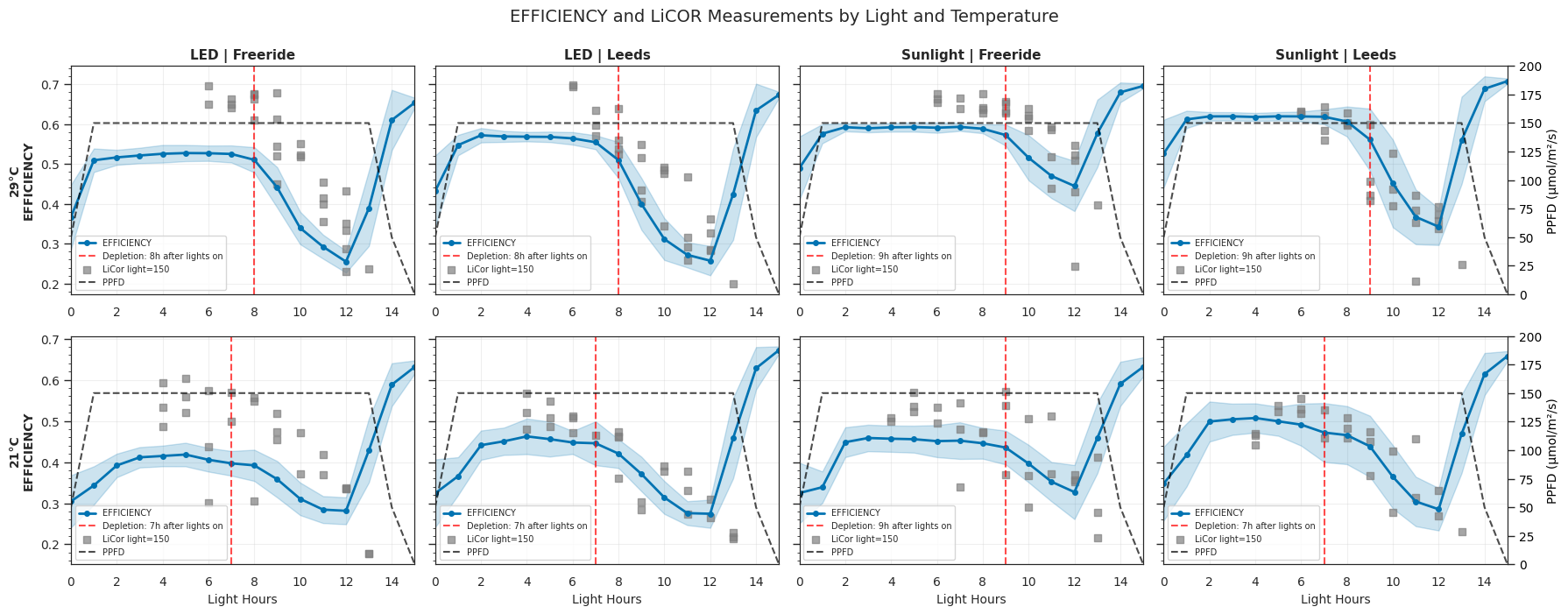 Gardin repeatedly detected declines in photosynthetic efficiency, with the timing varying between temperature, light source, and cultivar, with the largest decline observed under LED lighting. At 29 °C, efficiency begins to drop after 8 hours of LED light for both cultivars, compared with 9 hours under sunlight. At 21 °C, efficiency declines after 7 hours across all treatments except Freeride under sunlight, which maintains efficiency until 9 hours.